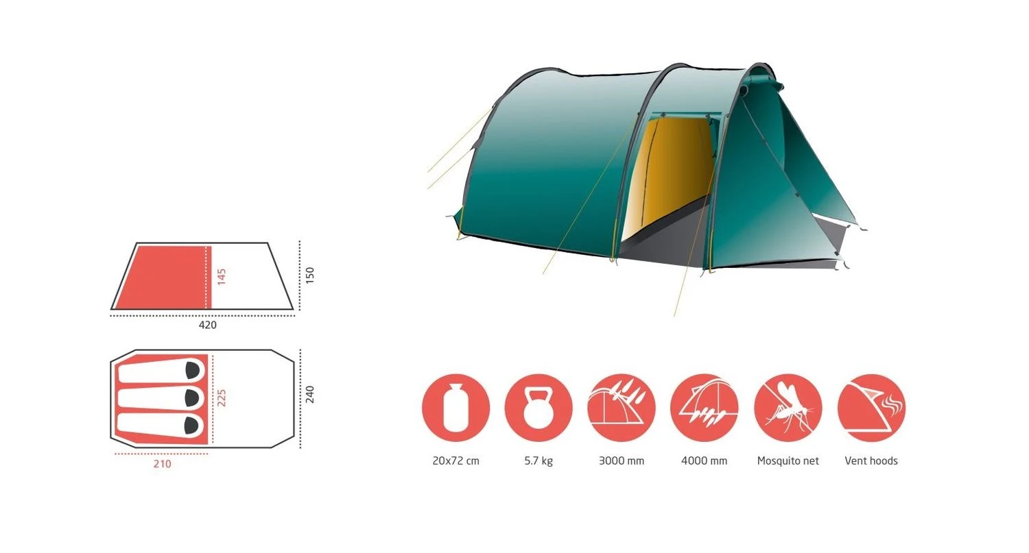 Wen Platz die größte Rolle spielt. ROBSON 3 ist der perfekte Begleiter für Ihre nächste Rad- oder Kanutour. Dank der einheitlichen Höhe im Innenzelt und in der Apsis bietet das Zelt ausreichend Platz für drei bis vier Personen im Schlafbereich und viel Platz für Ausrüstung und Gepäck in der Apsis. ROBSON 3 hat eine hervorragende Windbeständigkeit an der Längsseite. Die Moskitonetze am Innenzelt und die großen Belüftungsöffnungen mit Abdeckung auf der Außenplane sorgen für eine hervorragende Luftzirkulation und ein stets angenehmes Raumklima im Innenzelt.