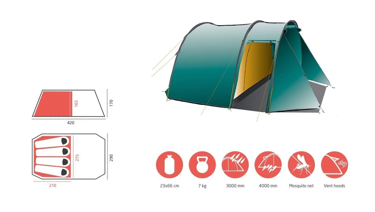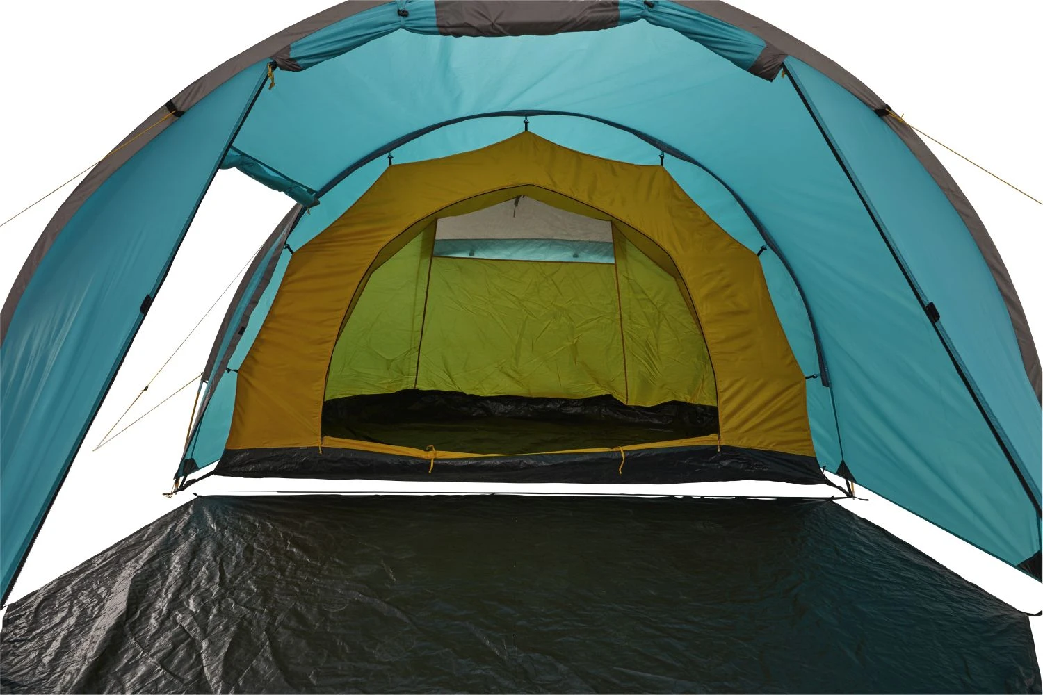 Noch größer! Im Inneren kann man durchgängig fast stehen. Tolles Raumgefühl. Ausreichend Platz für vier bis fünf Personen im Schlafbereich und viel Stauraum für Ausrüstung und Gepäck in der Apsis. Das Robson 4 von Grand Canyon hat eine hervorragende Windbeständigkeit an der Längsseite. Die Moskitonetze am Innenzelt und die großen Belüftungsöffnungen mit Abdeckung auf der Außenplane sorgen für eine hervorragende Luftzirkulation und ein stets angenehmes Raumklima im Innenzelt.