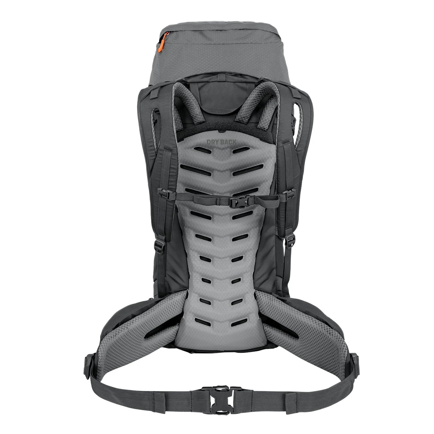 Schwere Last leicht tragen: ein komplett verstellbarer Rucksack mit 42 Litern Fassungsvermögen für mehrtägige alpine Trekkingtouren mit erweiterbarem Volumen von 5 Litern.