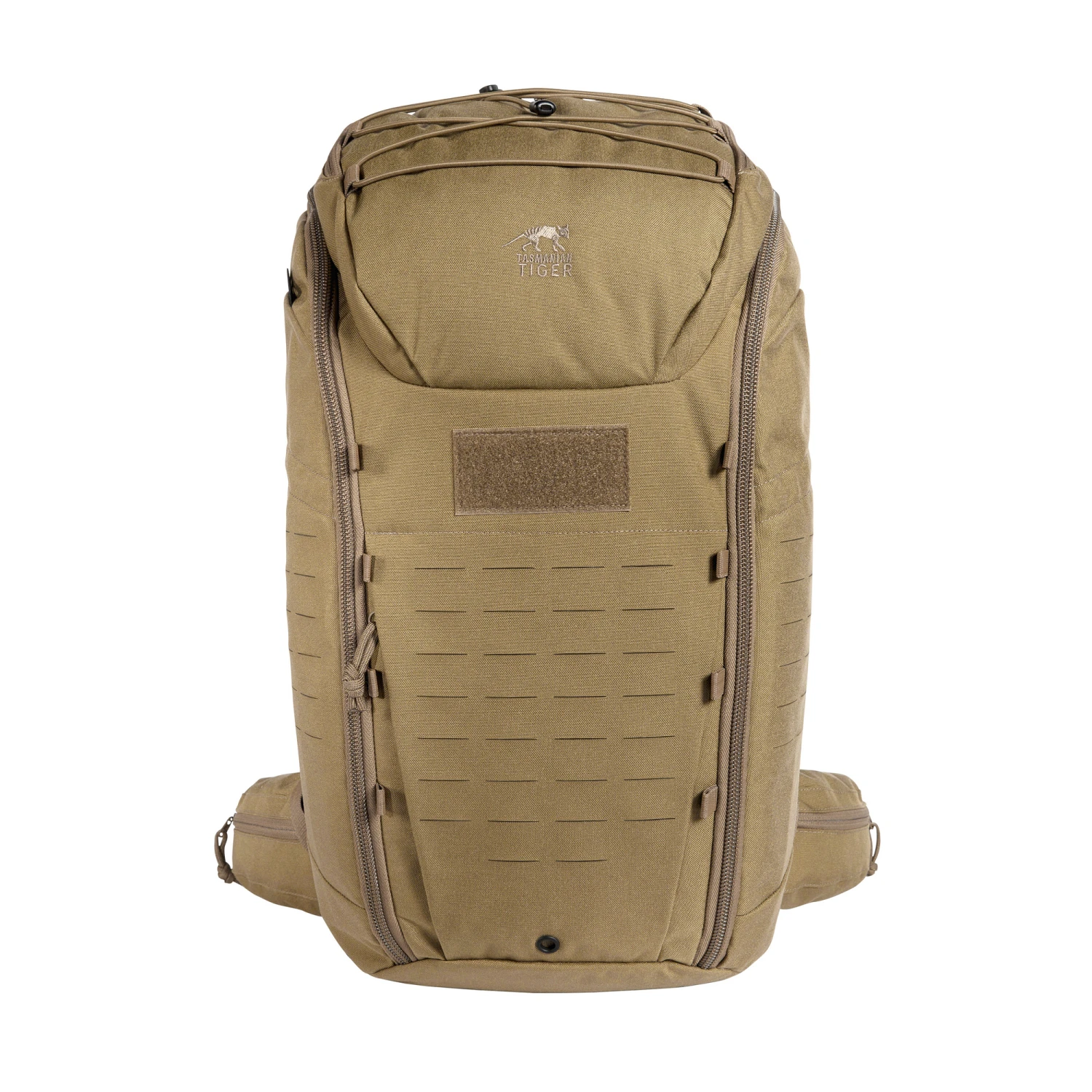 Modularer, universaler Einsatzrucksack. Der Rucksack besitzt eine Deckeltasche und ist an den Seiten und auf der Front mit MOLLE in Laser Cut-Ausführung versehen. Die Frontöffnung lässt sich komplett aufziehen. Die Innenseiten sind zur individuellen Ausstattung mit Klettflächen versehen. Die Hüftflossen sind abnehmbar. Auslieferung mit drei eingekletteten Zubehörtaschen und einer eingekletteten Waffenhalterung.
