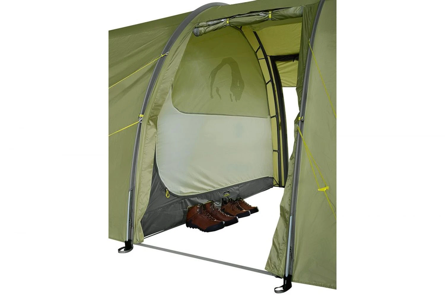 • Tunnelzelt mit vier Gestängebögen, zwei getrennten Schlafkabinen und zentraler Apside