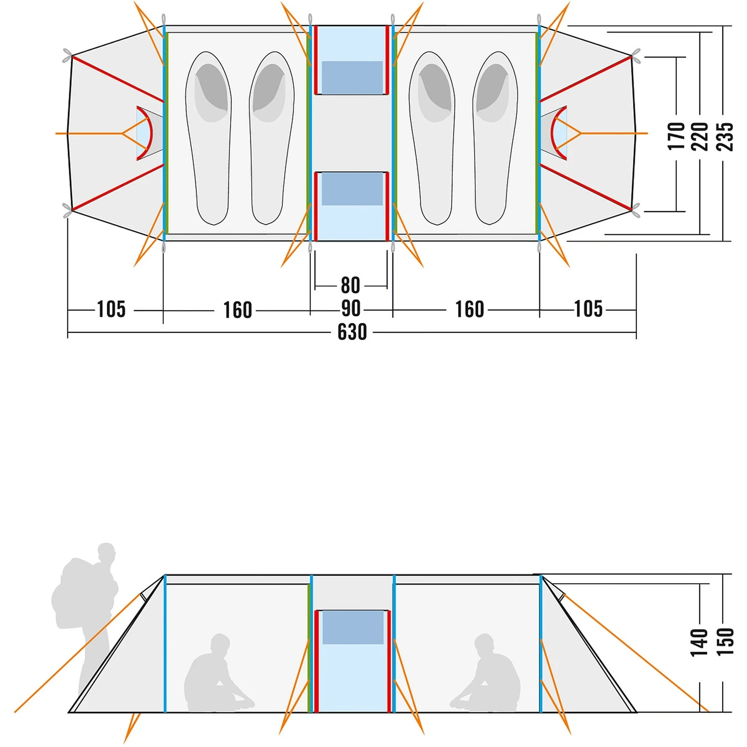 Familienzelt für vier bis sechs Personen in Tunnelzelt-Konstruktion mit zwei getrennten Schlafkabinen.