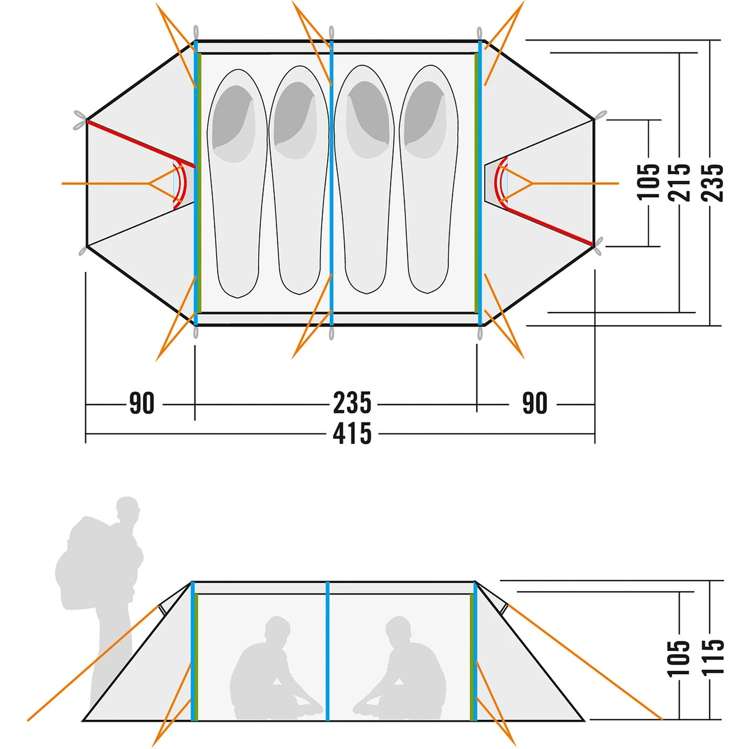 Das Außenzelt des 4-Mann-Zeltes ist aus leichtem, auf der Innenseite vierfach PU-beschichtetem, wasserdichtem Polyester mit einer eine Wassersäule von 8.000 mm gefertigt. Das Material ist farbecht und UV-beständig. Der wasserdichte Zeltboden aus PU-beschichtetem Nylon besitzt eine Wassersäule von 10.000 mm. Das Innenzelt besteht aus luftdurchlässigem Nylonmaterial, das Zeltgestänge aus Aluminium ist leicht und bruchfest.
