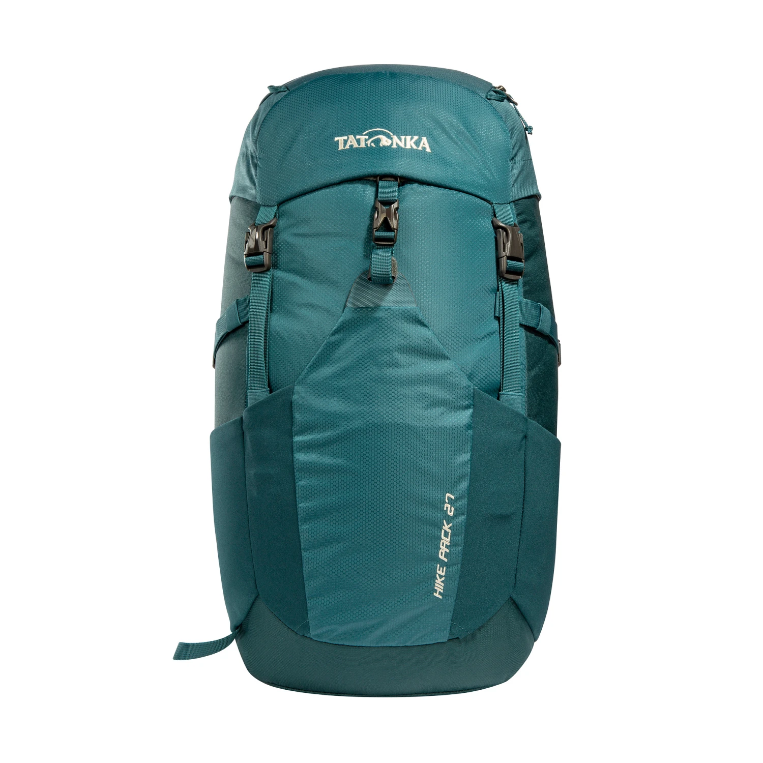 Klassischer Toploader-Wanderrucksack mit komfortablem, belüftetem Netzücken, 27 Liter Volumen, Hüftgurt mit Reißverschlusstasche, Wanderstockhalterung, Regenhülle und einer vorderen Einstecktasche für Klettersteig-Helm, Jacke oder ähnliches. Aus anteilig recycelten Materialien gefertigt