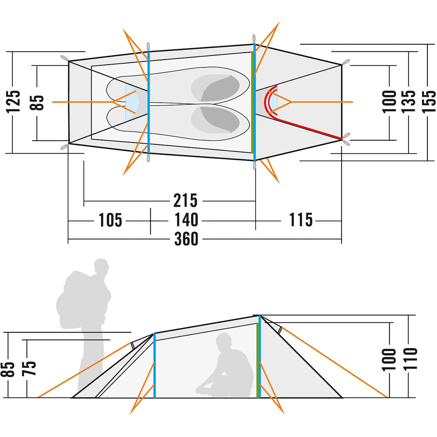 Das 2-Personen-Zelt wird mit zwei Gestängebögen aus leichtem, bruchfestem Aluminium aufgestellt, der Zeltschnitt mit dem verkürzten hinteren Bogen spart dabei Material und Gewicht. Das Außenzelt aus leichtem, auf der Innenseite vierfach PU-beschichtetem Polyester ist wasserdicht (Wassersäule 8.000 mm), farbecht und UV-beständig. Der wasserdichte Zeltboden aus PU-beschichtetem Nylon besitzt eine Wassersäule von 10.000 mm. Das Innenzelt besteht aus luftdurchlässigem Nylonmaterial.