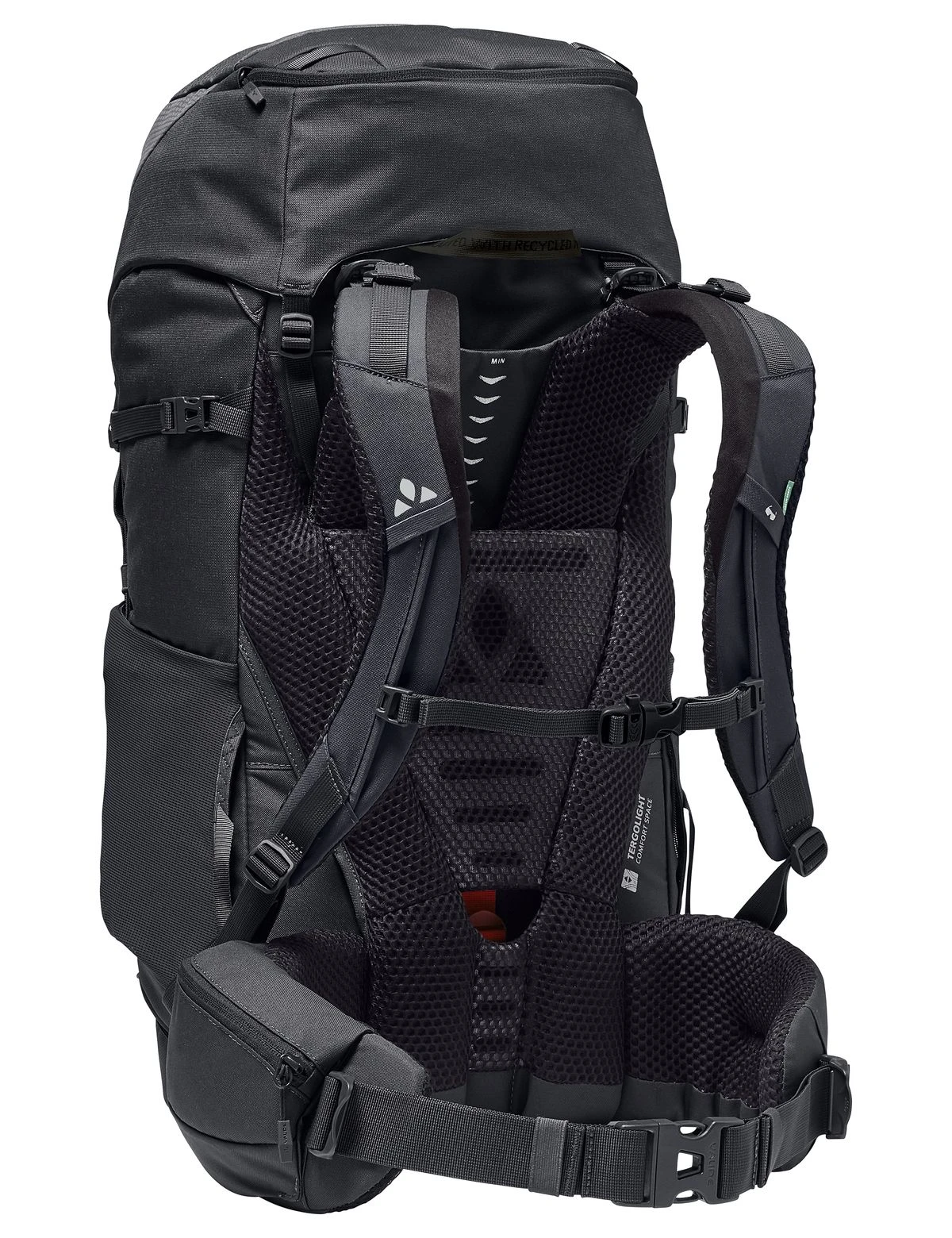 Alpintrekking, Hüttentouren, Pilgern und Backpacking – ein Trekkingrucksack für alles! 42 Liter Packvolumen kombiniert mit dem angenehmen Tragegefühl machen ihn zu einem beliebten Begleiter. Auch bei langen Touren sorgt das Tergolight Comfort Space-Tragesystem für hohen Tragekomfort. Rückenlänge und Lastenpositionierung des Trekkingrucksacks lassen sich an die Körpergröße anpassen. Auch der Rücken wird geschont: Die Aussparung im unteren Rückenbereich entlastet das Iliosakralgelenk. Die verstellbaren Ergoshape-Schultergurte lassen den Armen viel Bewegungsfreiheit und verteilen das Gewicht optimal, ebenso wie der komfortabel gepolsterte Hüftgurt. An das geräumige Hauptfach des Asymmetric 42+8 gelangt man von oben sowie von vorne – kein lästiges Herumkramen. Im elastischen Frontfach des Trekkingrucksacks findet alles Platz, was unterwegs schnell griffbereit sein muss. Dank der optimierten Belüftung des Frontfachs trocknet hier auch nasse Kleidung. Die elastischen Seitentaschen für Trinkflasche, Kamera oder Fruchtriegel sind zugänglich, ohne den Trekkingrucksack abzusetzen. Auch auf Alpintouren leistet der Rucksack gute Dienste: An der Materialschlaufe können Eispickel und Stöcke und an der Daisy Chain Steigeisen & Co. angebracht werden. Zwei Kompressionsriemen pro Seite sowie einer unter dem Deckel komprimieren das Gepäck. Der obere Riemen besitzt eine Ersatzschnalle, die unterwegs auch eine defekte Schnalle am Rucksack ersetzen kann. Der Deckel mit Innenfach ist höhenverstellbar und schafft so weitere 8 Liter Volumen. Der umweltfreundliche Trekkingrucksack wurde überwiegend aus Recylingmaterialien hergestellt. Das VAUDE Green Shape-Label steht für ein umweltfreundliches, funktionelles Produkt aus bluesign® zertifizierten, nachhaltigen Materialien.