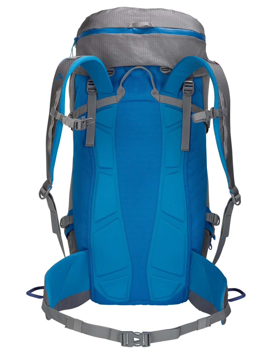 Einer für alles: vielseitiger Alpinrucksack für Mehrtagestouren und den ganzjährigen Einsatz beim Klettern, Bergsteigen und Skitourengehen. Sitzt sehr kompakt und stabil durch den Körperkontaktrücken (Synergy Mold Light mit anpassbarem Alurahmen). Die ergonomisch geformten Schulterträger bieten große Bewegungsfreiheit im Schulterbereich. Der flache, kurze Hüftflügel stört nicht beim Klettern und Tragen eines Sitzgurts. Der Tourenrucksack besticht durch seine cleane Optik und den Verzicht auf unnötigen Schnickschnack. Das Material ist robust und stark wasserabweisend, der Boden dank getapter Nähte wasserdicht. Der höhenverstellbare Deckel bietet einen sinnvoll unterteilten Stauraum für schnellzugängliche Dinge. Darunter verbirgt sich eine Seilhalterung. Das Trinksystemfach im Inneren ist größer dimensioniert und nimmt im Winter die Lawinenschaufel auf, Steckfächer für Schaufelstiel und Sonde sind vorhanden. Außen am Rucksack lassen sich zwei Eisgeräte und der Helm befestigen (Die integrierte Helmhalterung ist im Deckel verstaubar.). Seitliche Holster und die Kompressionsriemen geben den Ski einen sicheren Halt. Zusätzlich lassen sich über zwei Funktionsleisten weitere Gegenstände auf der Front fixieren (mittels Karabiner oder Gurtband). Der Rupal 45+ richtet sich an Bergsportler, die mit einem einzigen Rucksack eine große Bandbreite an alpinen Unternehmungen abdecken möchten.
