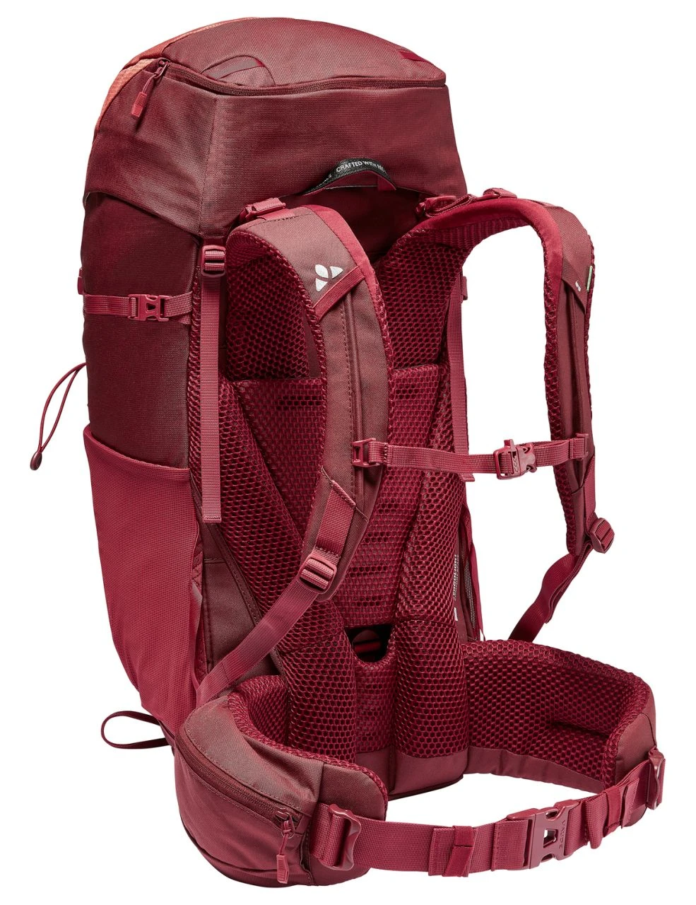 Ein Allrounder fürs Trekking! Egal, ob auf Hüttentour, beim Alpintrekking, Pilgern oder Backpacking: Der Damen-Trekkingrucksack mit 38 Liter Packvolumen vereint Tragekomfort und Stauraum. Dabei ist der Trekkingrucksack für Damen besonders rückenfreundlich: Die Aussparungen im unteren Rücken mindern den Druck auf das Iliosakralgelenk und beugen Rückenbeschwerden vor. Das Tergolight Comfort Space-Tragesystem garantiert optimalen Tragekomfort. Rückenlänge sowie Lastenpositionierung können individuell eingestellt werden. Kürzere Schultergurte, verkürzte Rückenlänge, speziell geformter und weich gepolsterter Hüftgurt: Der Damen-Trekkingrucksack passt sich der weiblichen Anatomie an. Die Ergoshape-Schulterträger entlasten und lassen den Armen Bewegungsfreiheit. Das Hauptfach des Damen-Trekkingrucksacks ist von oben und vorne zugänglich – kein lästiges Kramen. Im gut belüfteten Frontfach kann eine nasse Jacke trocknen und alles Notwendige griffbereit aufbewahrt werden. In den elastischen Seitenfächern sind Trinkflasche und Wanderkarte sicher verstaut und erreichbar, ohne den Damen-Trekkingrucksack abzusetzen. Helm, Eispickel und Trekkingstöcke finden an der Daisy Chain oder der zusätzlichen Materialschlaufe Platz. Pro Seite finden sich zwei Kompressionsriemen am Rucksack sowie ein weiterer unter dem Deckel mit integrierter Ersatzschnalle, falls unterwegs eine der Schnallen zu Bruch gehen sollte. Der höhenverstellbare Deckel mit Innenfach schafft bis zu 8 Liter zusätzliches Volumen. Dieser Trekkingrucksack für Damen besteht überwiegend aus Recyclingmaterialien. Unser VAUDE Green Shape-Label steht für ein funktionelles, umweltfreundliches Produkt aus nachhaltigen sowie bluesign® zertifizierten Materialien Materialien.